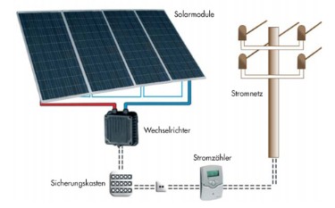 Die Fläche des Solargenerators bestimmt natürlich die Leistung - als ca. Wert kann hier 1 kWp elektrische Leistung pro 8 m² Modulfläche angenommen werden. Der Solargenerator wird elektrisch verschaltet und mit dem Wechselrichter verbunden. Dieser wandelt die Gleichspannung des Solargenerators in eine netzfähige Wechselspannung um, und speist die erzeugte Energie über den Einspeisezähler ins öffentliche Stromnetz ein.